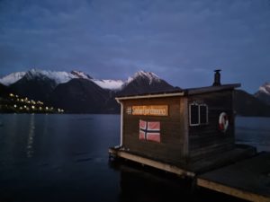 Etter programmet første dagen fekk dei som ønska det ein tur i Sæbø Fjordsauna. Dei barskaste tok også ein frisk dukkert i sjøen. Temperaturen ute var 6 minus!